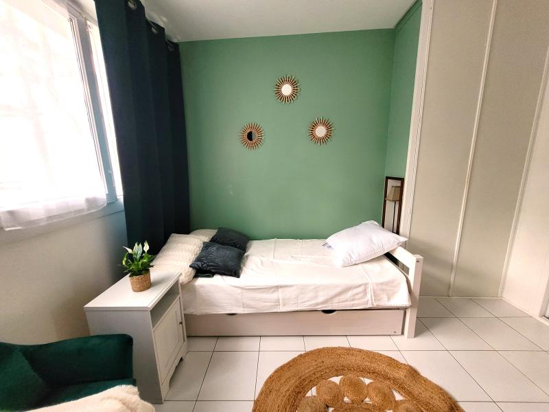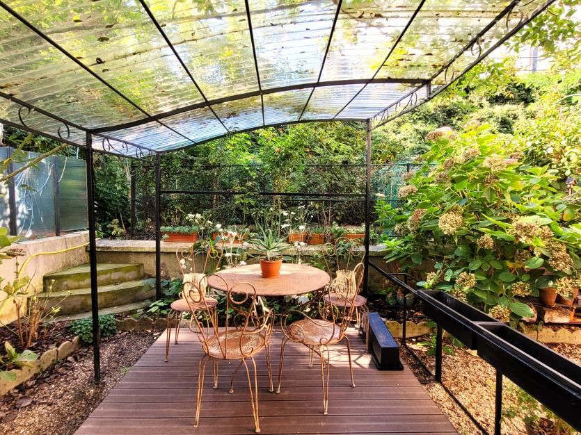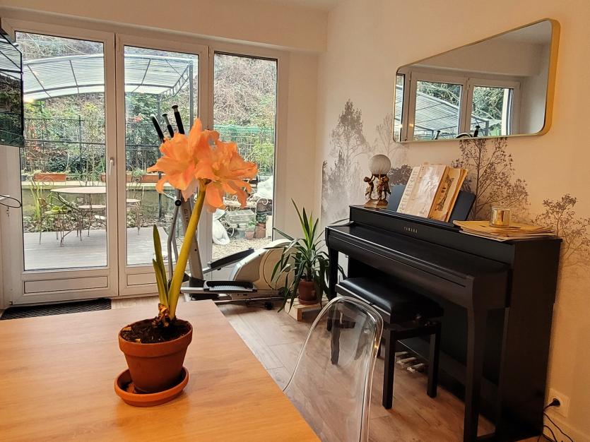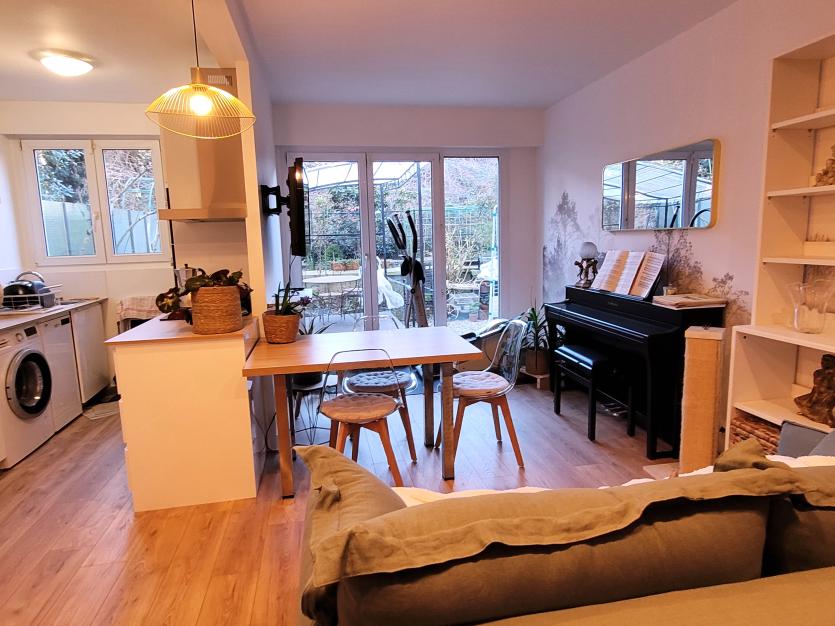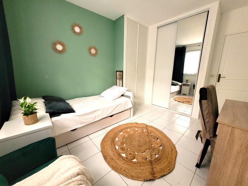 Chambre chez l'habitant: Appartement joliment décoré style "zen". chambre 12 m2 meublée (lit, bureau, placards très spacieux,en colocation: SDB commune à 3 chambres. WC indépendants avec lavabo. Cuisine américaine avec salon, jardin privatif (avec pergola)