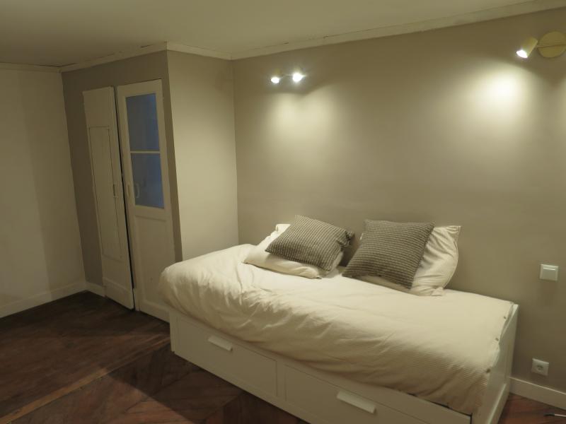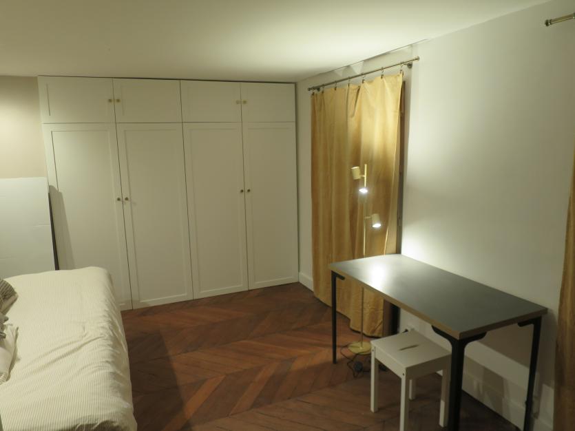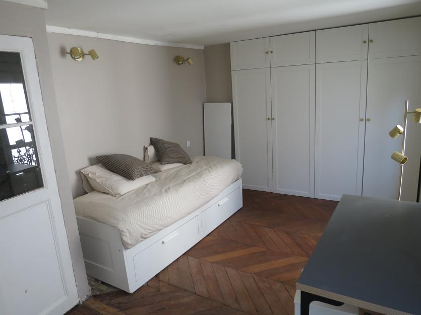 Studio rénové 23 m2, 5ème ét. 2 fenêtres sur vaste cour calme. Station Gare de l'Est: 20' l. 4 direct Sc. Po. Cuisine équipée, SDB, WC ds appart. Meublé à neuf : vaisselle, table, chaises, lit, linge, etc. Ttes charges comprises, dont wifi, EDF, assurance.